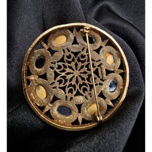 Crafted in the unmistakable style of mid-20th century costume jewelry, this vintage Corocraft brooch is a radiant relic of opulence. The circular design features a filigree floral centerpiece in antique gold-tone metal, blooming with botanical motifs that echo Victorian and Baroque influences.
