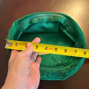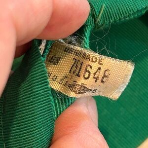 This listing is for a vibrant green, vintage turban ladies hat. The material has a soft, velvet feel, and the inside tag states that it was union made. With the union stamp on the back. It is in excellent vintage condition still retaining its sharp green shade.