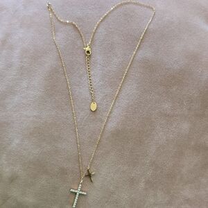 used. not real gold. 20 inches long. the pendant does not slide so you have to clasp it to the first hole