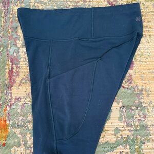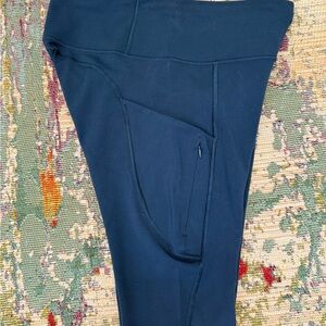 Comfortable navy athletic capri pants. Features side pockets on each pant leg and also a zipper feature on the pocket on one side of the pant leg. Ideal for casual wear.
