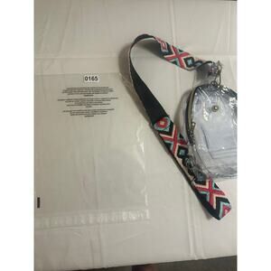 🎒 Stay stylish and stadium-ready with this clear mini backpack! Features a secure zip closure, small card pocket inside, and a fun detachable woven Aztec-style strap in bold red, turquoise, and black. Compact yet roomy enough for your phone, wallet, and game-day must-haves. Perfect for concerts, sporting events, festivals, or travel! 🏟️🌈