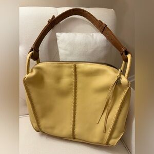 Chic tan leather shoulder bag with elegant design. Features sturdy straps and gold-tone hardware. Ideal for everyday use.