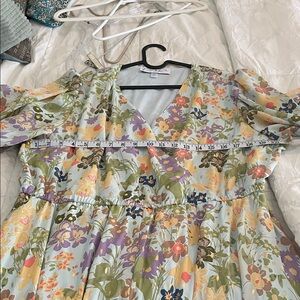 Chic high low dress with pastel floral design. Features soft hues and elegant flow. Ideal for special events.