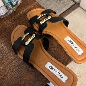 Elegant Steve Madden sandals with black straps and brown sole. Perfect for casual wear. New never been worn.