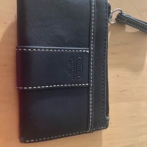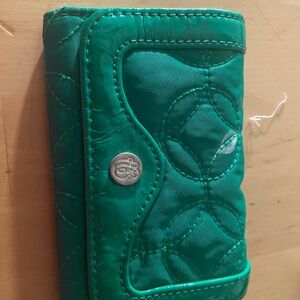 Vibrant set of wallets. Includes a green quilted wallet, a black wallet, a floral patterned wallet, and a watermelon-shaped keychain. Perfect for adding color to your accessories.