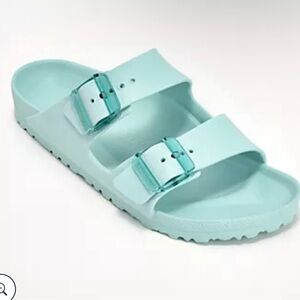 Stylish Birkenstock sandals with a stealth buckle design. Comfortable and durable. Perfect for casual wear. The Arizona Essentials sandal is made from water-friendly material, giving you a flexible design built on the contoured footbed you love most. With translucent buckles, it's the perfect throw-and-go style for everything from the pool to post-workout.