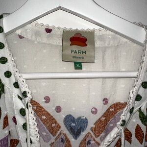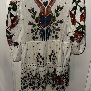 Beautiful boho dress with vibrant floral embroidery. Features a mix of colors on a white base. Size XL