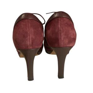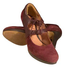 A sophisticated Mary Jane pump from Clarks Artisan line in a rich aubergine blend of smooth leather and suede. Features a ghillie-style lace-up front, 3⅓″ flirty heel with a ½″ platform, and a cushioned OrthoLite® footbed for all-day comfort. Effortlessly pairs with skirts, tailored trousers, or dresses.