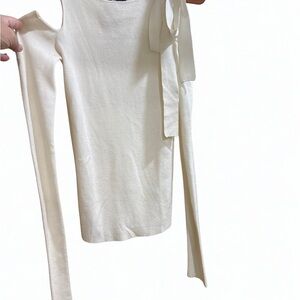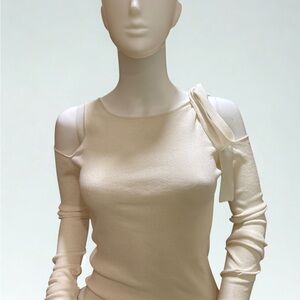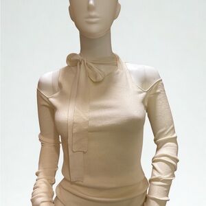 A rare archival piece from the Tom Ford era at Gucci — this stunning soft white knit top features cold shoulder cutouts, an elegant self-tie neckline, and a sleek, body-skimming silhouette. Crafted in Italy from a luxurious stretch knit, this piece embodies the minimalist sensuality Ford championed during his iconic tenure at Gucci from 1994–2004.