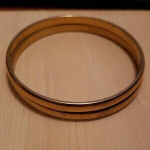 Twin bracelets! Good gold-tone fashion jewelry. Light but sturdy, won't easily bend out of shape. Have a nice ring when they clink together. Each measures 2.5" across. Simple, classic. In good condition.