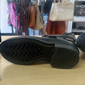 Rugged black leather boots. Features iconic eagle and logo design. Double buckle straps for secure fit.