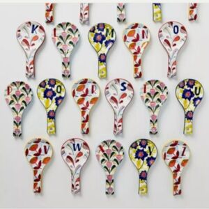 This Anthropologie Ceramic Spoon Rest is a stylish addition to any kitchen, featuring a playful multicolor floral pattern with the letter "E" design. Made of ceramic, it adds a touch of contemporary flair to your cooking area. Perfect for all occasions, this spoon rest is both functional and decorative, showcasing your love for floral and garden themes. Made in China, it is a unique and charming piece that adds personality to your kitchen decor.
