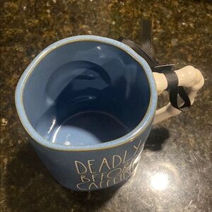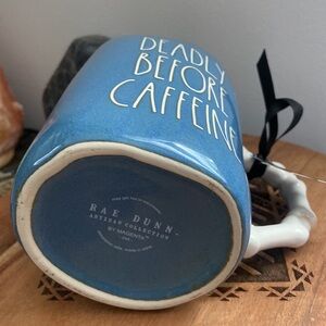 New & unused! Rae Dunn double sided Halloween inspired skeleton skull mug with Skelton bone handle & Deadly Before Caffeine on the other side. Enjoy your favorite beverages with this unique blue mug featuring a striking skull design and a skeleton handle. Perfect for adding a touch of whimsy to your drinkware collection. *each mug is unique & may have imperfections, that’s what makes Rae Dunn mugs so much fun.