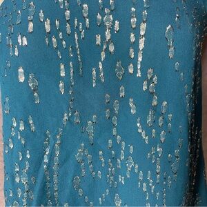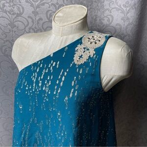 It’s features a one-shoulder neckline, a flowy or "swing fit" body, and is sleeveless.Teal color with metallic clip dots and a decorative applique or beaded embroidery on the shoulder.