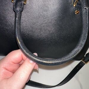 An iconic black satchel by Michael Kors. Features elegant gold-tone accents and saffiano leather with a detachable and adjustable shoulder strap. The charms are an added bonus! 🖤 This bag is in very good condition with slight discoloration on the glazing on the back handle.