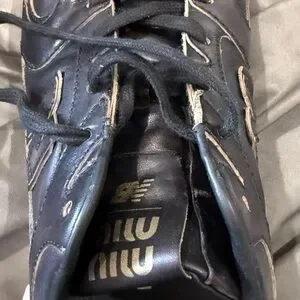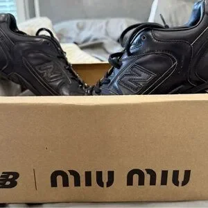 MIU MIU AND NEW BALANCE COLLABORATION, black vintage distressed shoe, size 39, with MIU MIU shoe bags and original box. Worn very little.