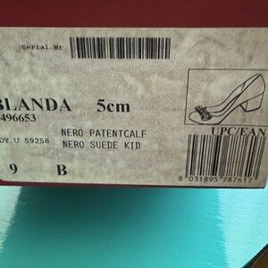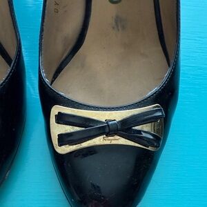 Elegant black patent with gold heels with a gold accent bow. Perfect for adding sophistication.