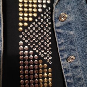 Elevate your style with this chic denim jacket and tank featuring eye-catching silver studs and crystal accents. Perfect for adding a touch of glam to any outfit.