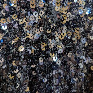 - Is labeled a size 6 but runs small and fits like a size 2 **Dress has a barely noticeable patch of missing sequins on the right side of the zipper on the back of the dress**(pictured) - Approx measurements: - Bust: 33.5" - Waist (Smallest part of the waist) : 25" - Hips: 35" - 60" front length from shoulder to hem; 66 1/2" back length - Built-in bra cups - Bustier bodice - Adjustable spaghetti straps - Corset & zip back closure - Side Slit