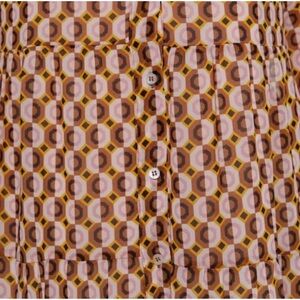 Stylish brown maxi dress with geometric pattern. Features long sleeves and a belted waist. Perfect for any occasion.