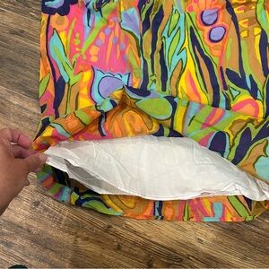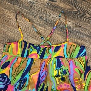Make a bold statement with this stunning Tori Richard sundress, made in Hawaii! Featuring an eye-catching, vibrant floral and abstract print in neon shades of orange, pink, green, and blue, this dress is lightweight, fully lined, and perfect for warm weather.