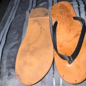 Stylish brown leather flip flops featuring black straps. Perfect for casual wear.