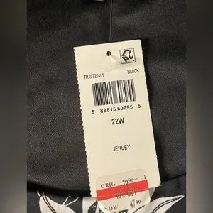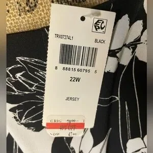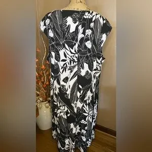 Stylish midi dress with bold floral leaf pattern. Features a classic black and white design. Sleeveless scoop neck. New with Tags. 22W PTP 24.5 inches Stretchy material