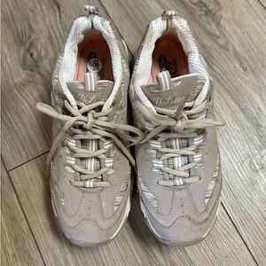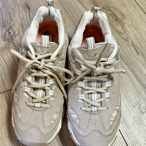 Skechers Womens Size 8.5 D'Lites Interlude Training Sneakers Taupe Leather Stylish Skechers sneakers in beige. Perfect for casual outings. Comfortable and trendy design.