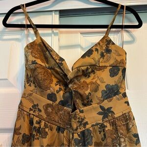 Elegant wide leg jumpsuit. Mustard base with floral green pattern. Spaghetti straps and sweetheart neckline. Perfect for any occasion.