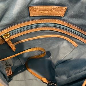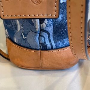 Dooney & Bourke Disney Magic Kingdom 45th Anniversary Letter Carrier 2016 is screen print on coated canvas. There is a gold colored metal square on the front stamped Dooney & Bourke 1975 with a leather tag stamped 45th Anniversary Magic Kingdom and Mickey Mouse on the front. The shoulder strap along with two leather zipper pull tabs on the outside of handbag along with a leather zipper pull tab on the interior pocket. Leather piping flanks the bottom of the handbag along with leather on the bottom corners. Leather has some water spots and bottom corners have minimal dark marks as seen in pictures. Interior lining is a sky blue material. There is a leather rectangular piece stamped Dooney & Bourke Since 1975 stitched in the lining. There are also three leather piped slit pockets along with the zippered pocket. There are two tags stitched in the lining. One is: Dooney & Bourke, Inc.
