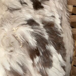 Fur is trending for winter this year! Layer this vest with a cute long sleeve underneath for a Scandi-girl look. 100% dark brown/white rabbit vest. Hundreds of hide strips hand woven onto a crocheted vest. Clasp front closure and collar. This is a homemade vest without tags. Size M/L