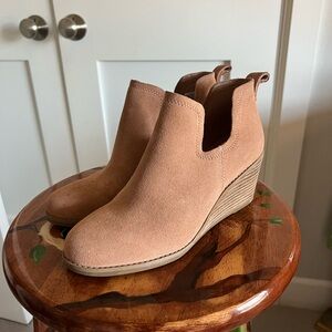 White block heeled ankle boots with square toe. Size 6.5. I think the brand is WILA. All normal wear and tear is pictured! Just washed the boots from top to bottom, ready for the next owner! 3.5” heel and 4.5” from back of heel to top of boot.
