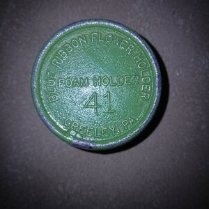 Round green ceramic bowl with a floral frog in the center. Textured exterior adds a unique touch. Beautiful condition, has cast iron foam stand included.