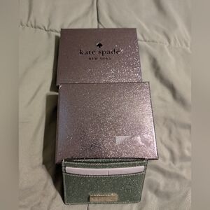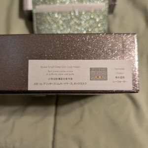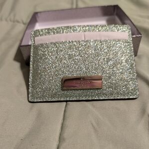 Elegant card case with shimmering silver glitter. Features sleek design and brand logo.