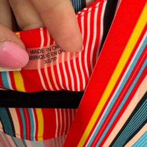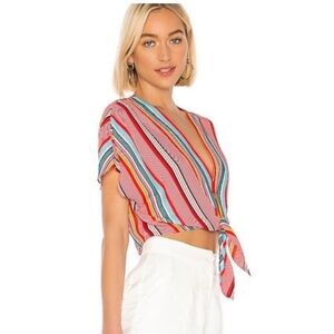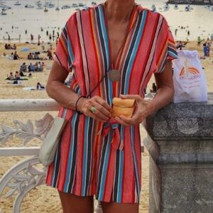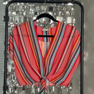 Vibrant striped set with a tie-front top and matching shorts. Features red, pink, and blue stripes.