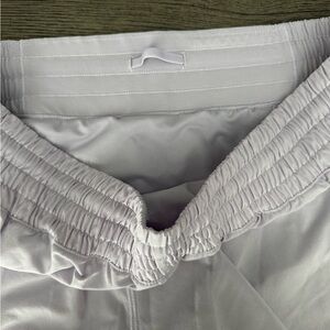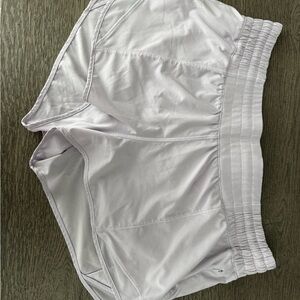 Lulu Lemon Hotty Hot 2.5 short. They are a light purple color that is hard to see (but they are not white). They are a size 10 and slightly worn.