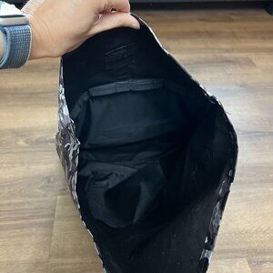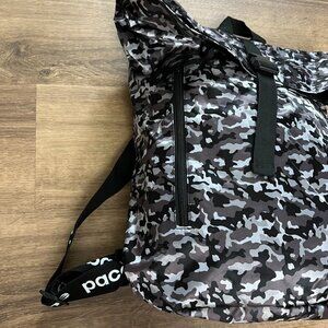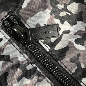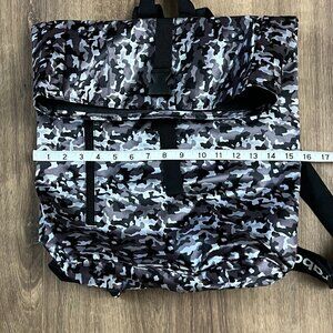 I really enjoy this backpack for a bit of utilitarian style. Black, gray, and white camouflage in a thicker smooth fabric (holds its shape). Black and white branded adjustable straps, adjustable front snap closure and front zippered pocket. This was purchased, stored in a closet and never used. Great size! Holds a lot but you don't feel like you are carrying a large hiking backpack.
