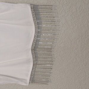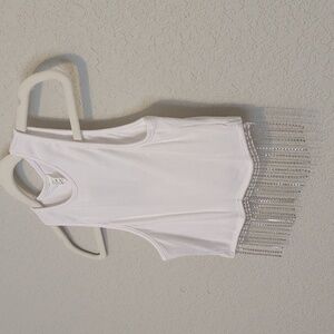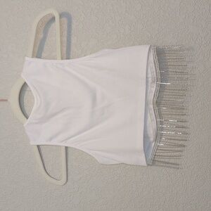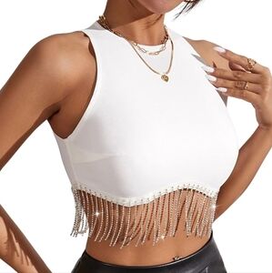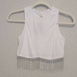 Milumia white ribbed sleevess round neck cropped tank top with rhinestone fringe