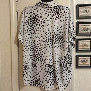 CAbi’s popular Replay top in geometric black and white design. Very versatile. Gently worn
