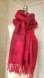 Deep red and black scarf with a rose and paisley pattern on front, solid red on back. Fringed at ends. Excellent condition. 19" width x 80" length. I think fabric is wool or acrylic, soft and warm!