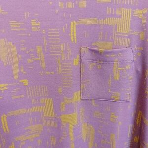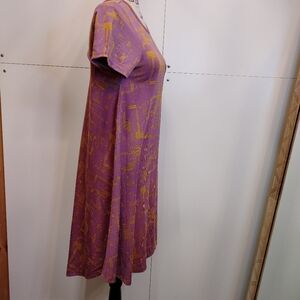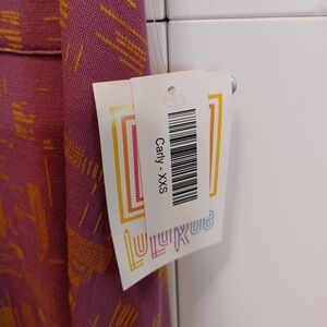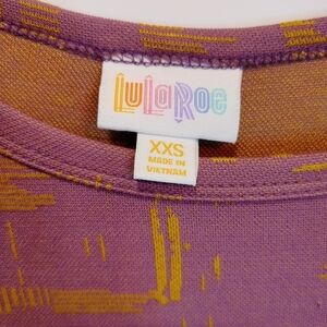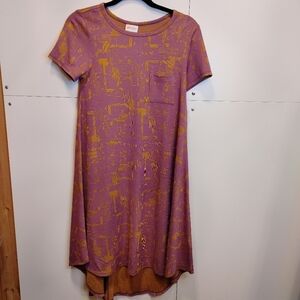 LuLaroe Carly High Low Midi dress. NWT. Size XXS. Oversized fit. Approximately 16.5 inches pit to pit, 37.5 inches length (front), 43 inches length (back). 55% Rayon, 42% polyester, and 3% spandex. Very stretchy. Can fit many sizes due to stretch. It is in a purply pink color with a mustard yellow type shade. Colors are a bit washed out on photos/video. Pattern distorts images. Short sleeves, scoop neck, high-low swing dress, pullover dress, with a breast pocket. Simply Comfortable. Unicorn.