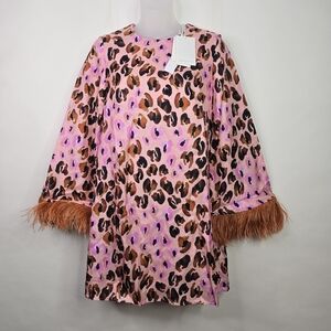 Borgo de Nor Pink Leopard Print Cocoa Dress with Feather Trim