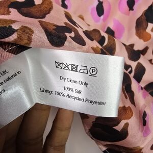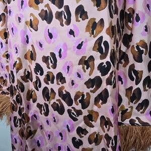 Designed with a loose, mini-length silhouette. Silk fabric has a softened, lightweight feel and offers no stretch. Fabric: Lightweight, non-stretch silk crepe. Animal print. Ostrich feather cuffs. Crew neckline. Button keyhole at back. Shell: 100% silk. Lined (100% polyester). US size 2
