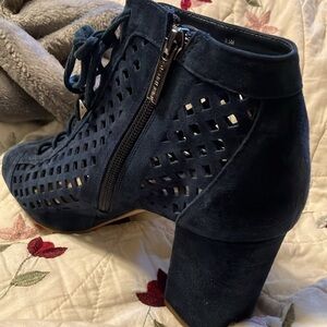 Elegant Navy Blue Lace-Up Block Heels Open Toe Inside Heavy Duty Zipper Sz 9.5M