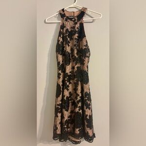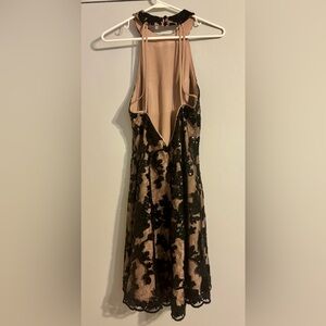 Chic backless dress with black lace overlay. Cream underlay enhances elegance. Perfect for evening wear.