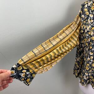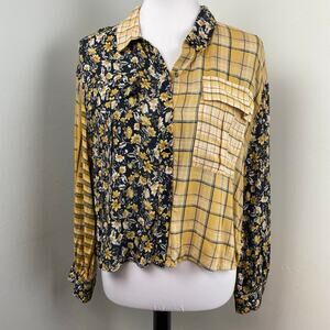 Zara Mixed Print Floral Plaid Button Down Crop Long Sleeve Blouse Top Large