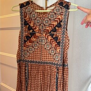 Intricate geometric patterns. Sleeveless design. Earthy tones.