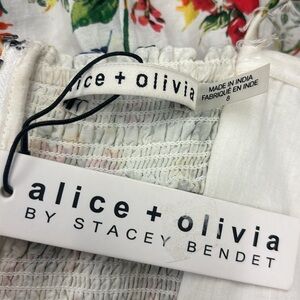 Alice + Olivia Valencia Floral Tiered Maxi Dress in Dew Floral. square neckline and adjustable spaghetti straps ensure a customizable fit. a back zipper closure.