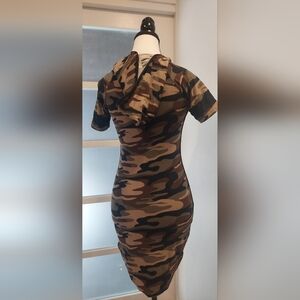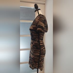 Stylish mini dress with a unique criss-cross front. Features a striking camouflage design. Perfect for casual wear.