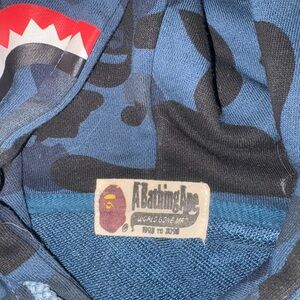A Bathing Ape camo hoodie with shark design. Features blue and black camo pattern.